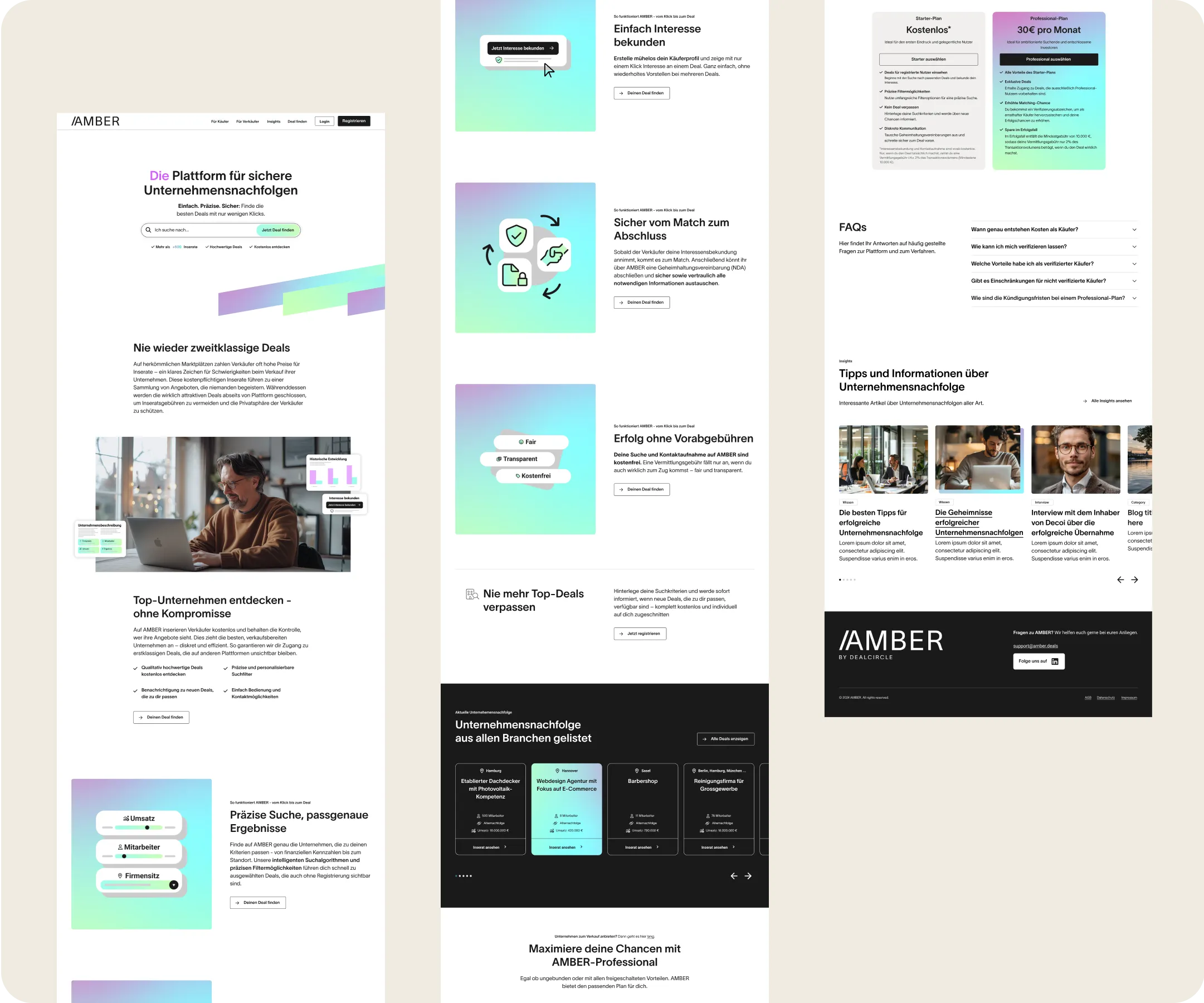 Mit AMBER (ehemals Flint) schafft DEALCIRCLE eine digitale Plattform, die den Nachfolgeprozess neu denkt. Verkäufer und passende Käufer werden zusammengebracht, um Unternehmensnachfolgen smarter und schneller zu gestalten. Wir durften AMBER von Anfang an mitgestalten: Vom Corporate Design über UX & UI bis hin zur Umsetzung der Web-Plattform. Das Projekt markierte nicht nur den Start einer starken neuen Marke im M&A-Markt, sondern war zugleich der Anstoß für das Redesign der Hauptmarke DEALCIRCLE.